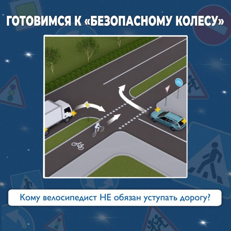 Перед вами перекрёсток, на котором встретились три транспортных средства. Кому велосипедист НЕ обязан уступать дорогу? Внимательно посмотрите на изображение, вспомните значения дорожных знаков и правила проезда перекрёстковКакой будет ваш ответ?...
