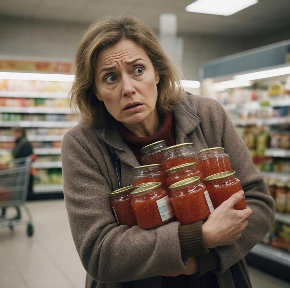 В магазине на ул. Победы женщина похитила две банки икры (нерки и стерляди) на сумму около 10 000 , спрятав их в сумку. Для отвода глаз она оплатила другие товары. Спустя несколько дней вернулась и украла еще две банки икры на 14 000 .