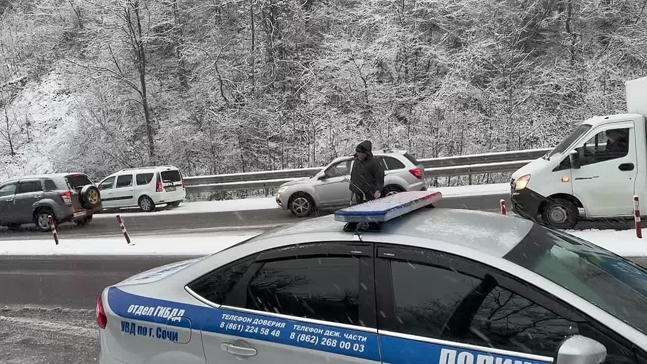 В связи с обильным снегопадом и ухудшением видимости, сотрудники Госавтоинспекции г. Сочи осуществляют распорядительно-регулировочные действия на федеральной трассе в районе Мамайского перевала.