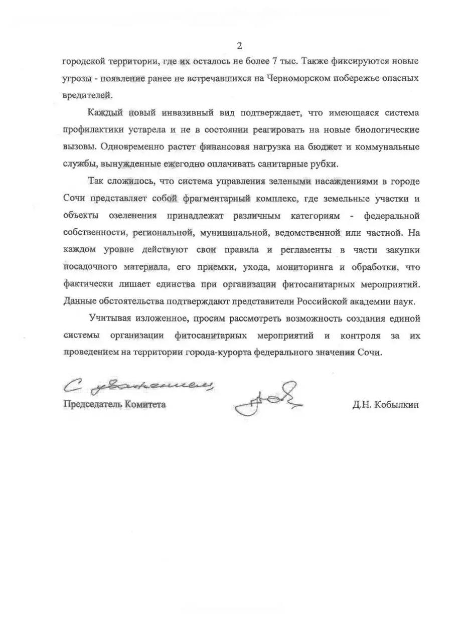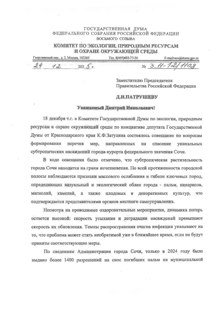 Продолжение разговора о судьбе субтропиков в Сочи, начатого вновь в ноябре-декабре 2025 года с запроса депутата Государственной Думы Константина Затулина в адрес руководителей Министерства природных ресурсов и экологии Российской Федерации, Россельхознадзора и Российской академии наук и проведения 18 декабря 2025 года круглого стола в Комитете Государственной Думы по экологии, природным ресурсам и охране окружающей среды: сегодня, 14 января, депутат Константин Затулин переговорил с председателем профильного Комитета ГД Дмитрием Кобылкиным и Министром природных ресурсов и экологии Александром Козловым.