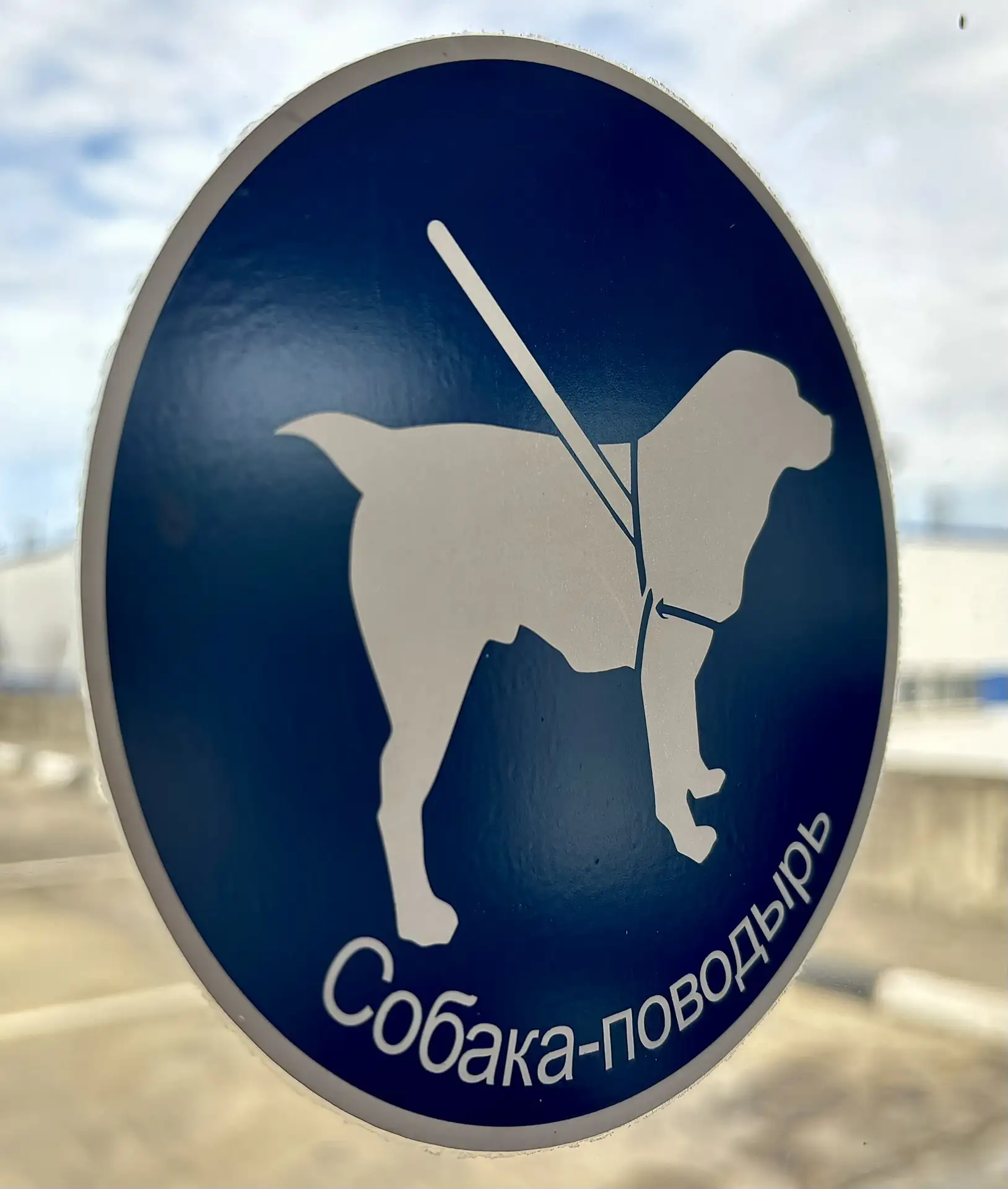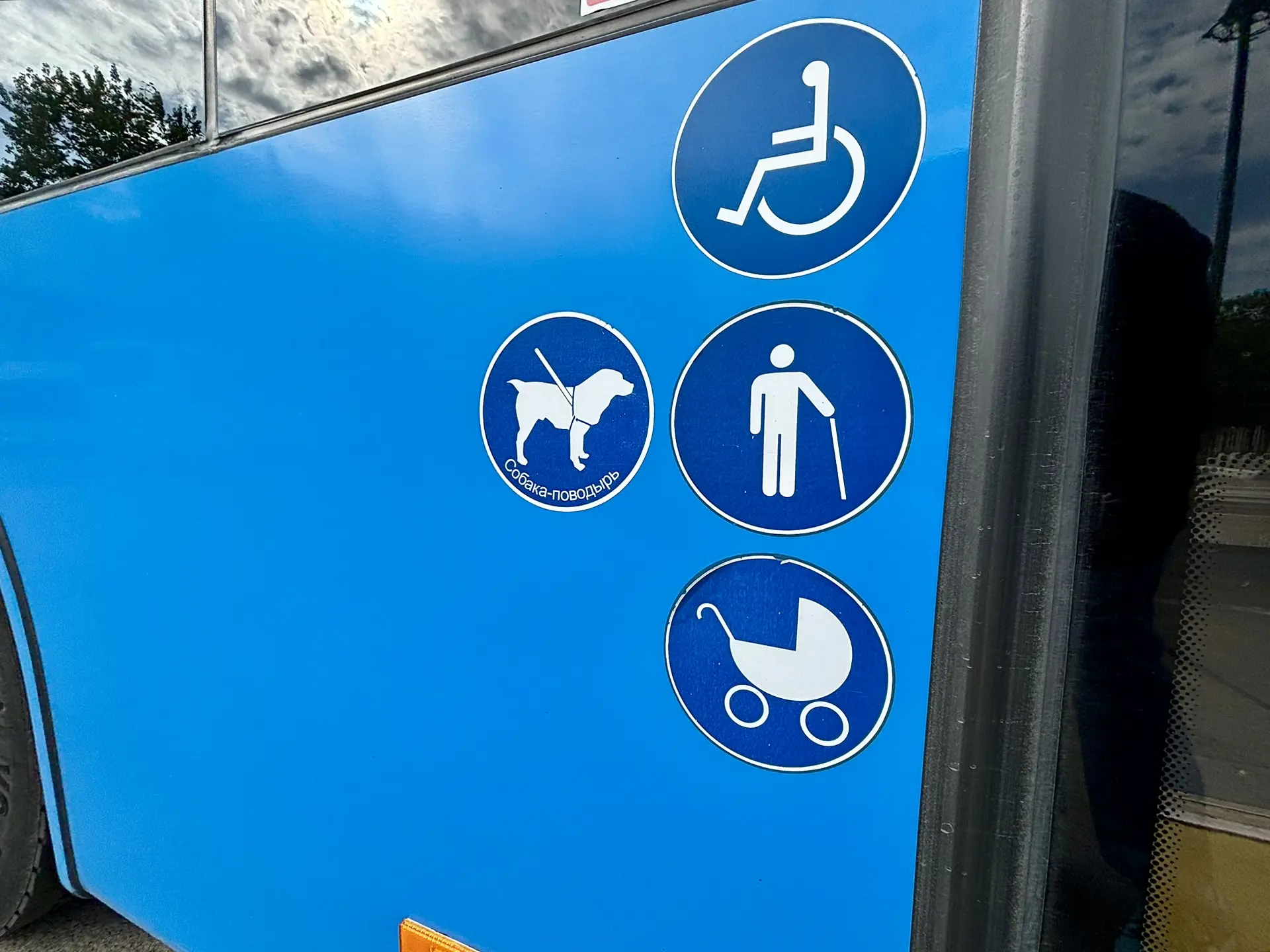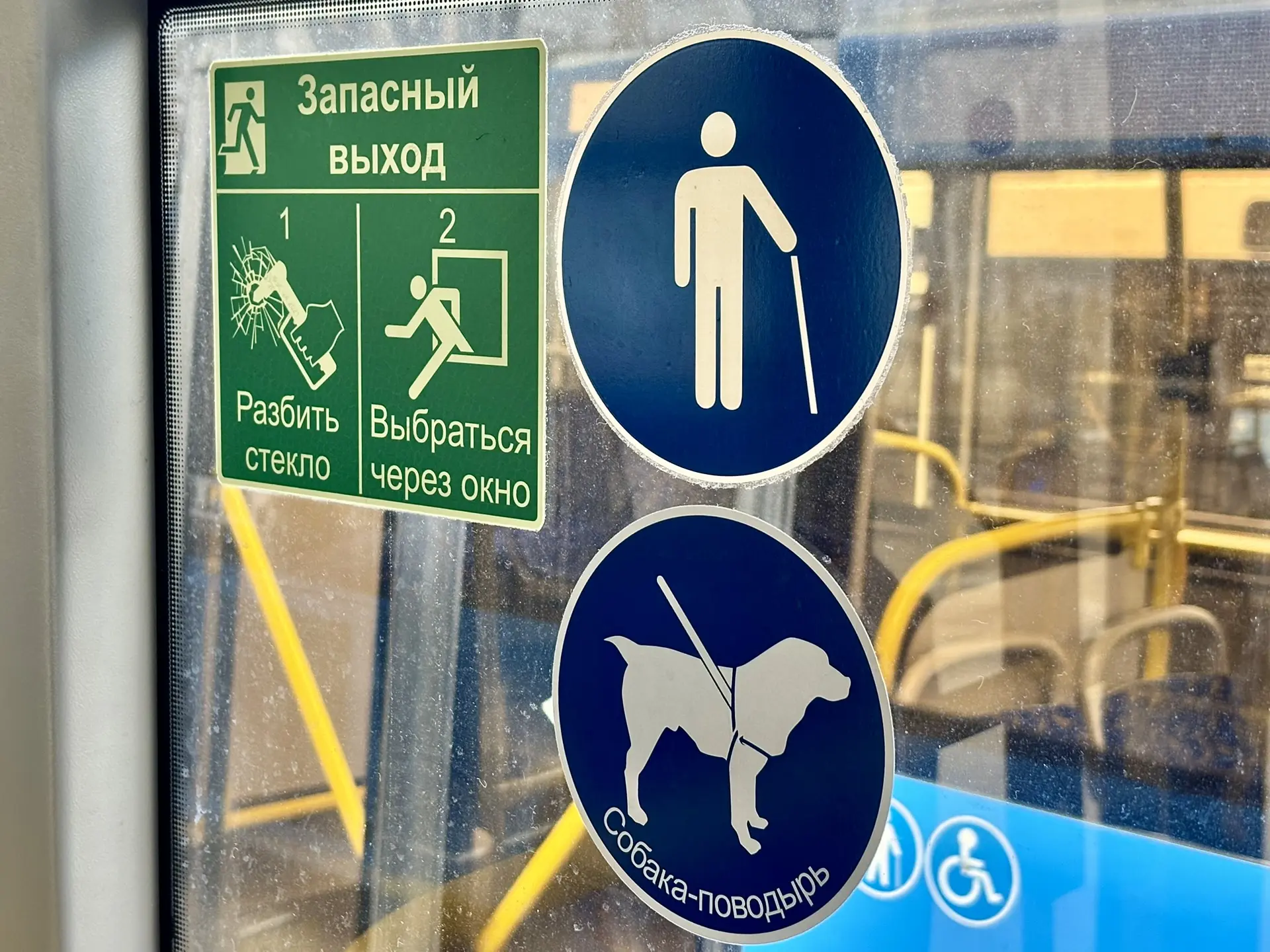 В городских автобусах есть специальные места для пассажиров с собаками-поводырями — они обозначены наклейками. Пожалуйста, обращайте на них внимание и уступайте место.