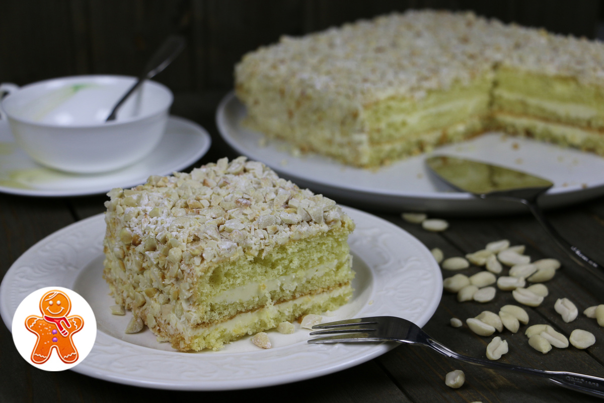 Для крема в кастрюле смешивают молоко и сахар, греют до полного растворения сахара, ориентировочно до кипения. Затем, взбивая, тонкой струйкой подливают молоко в яично-сахарную массу. Эту смесь снова ставят на огонь до загустения, после чего охлаждают, не забывая перемешивать, чтобы не образовалась корка. Сливочное масло должны предварительно вынуть из холодильника для размягчения. Взбивают масло, постепенно добавляя остывший сироп из молока. В конце добавляют коньяк, и крем готов. Сначала корж пропитывают, затем наносят крем и укладывают следующий слой. Таким образом, формируют целый торт, покрывая верх и бока кремом, который обсыпают жареным арахисом. Завершающий штрих — посыпка сахарной пудрой. Торт лучше всего оставить в холодильнике на несколько часов, чтобы он стал более ароматным и пропитанным.