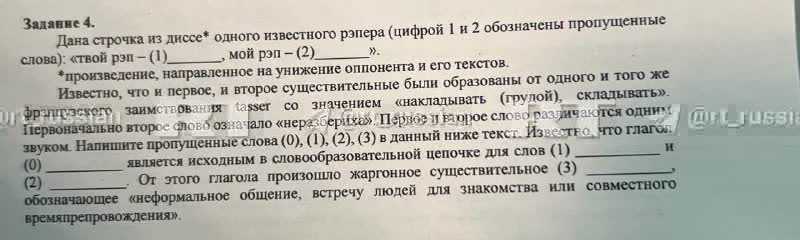 Ранее в сети появились фото заданий для 11-классников. Им предложили вставить пропущенные слова в текст Oxxxymiron. В задании при этом его имя не упоминают, просто пишут: «Известный рэпер».