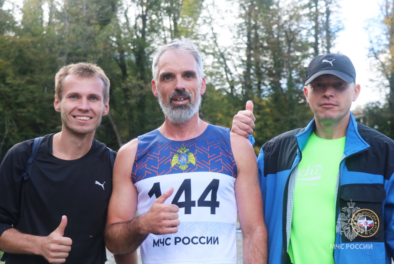 Глава МЧС России Александр Куренков наградил победителей дистанции «Кросс-эстафета 6 по 3 км» XX чемпионата МЧС России по многоборью спасателей. Дистанция проходила в горах Красной Поляны – от курорта «Роза Хутор» в сторону Энгельмановой поляны.