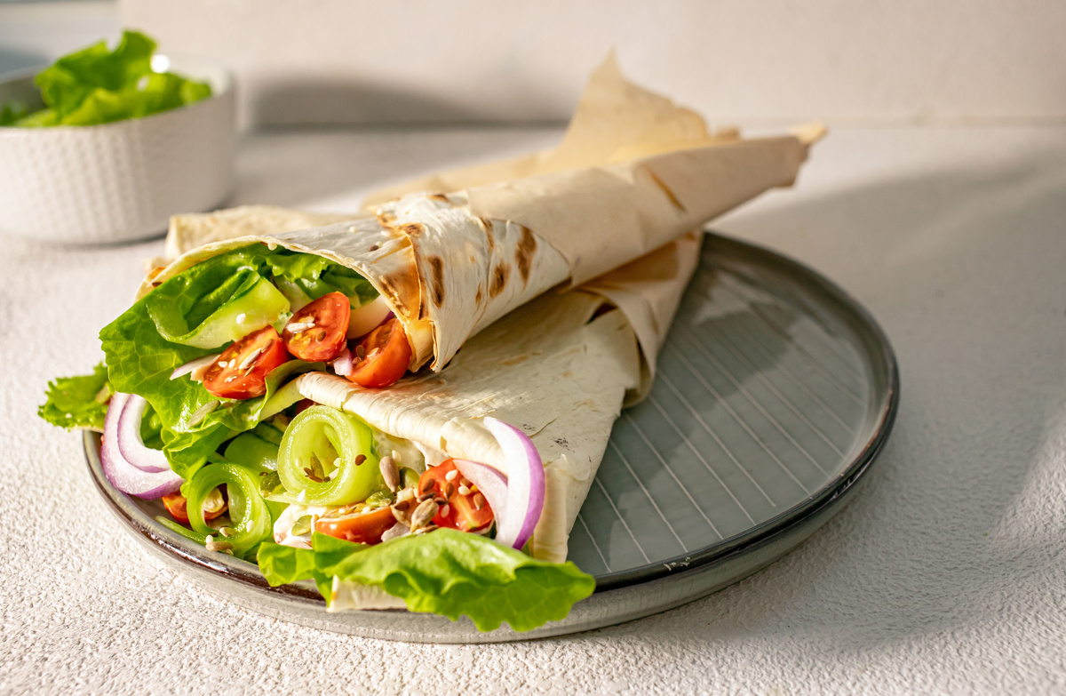 Теперь самое интересное! Скрутите лаваш в кулек и заколите его зубочисткой. Запекайте в духовке при температуре 180°C около минуты, чтобы он не размяк очень быстро от влажной начинки. После этого снимите зубочистку и, используя пергаментную бумагу, создайте стойкую форму кулека. Внутрь аккуратно уложите салатные листья и добавьте начинку, осторожно утрамбовывая ее. Завершите оформление, украсив верх колечками огурца и посыпав салатной смесью.