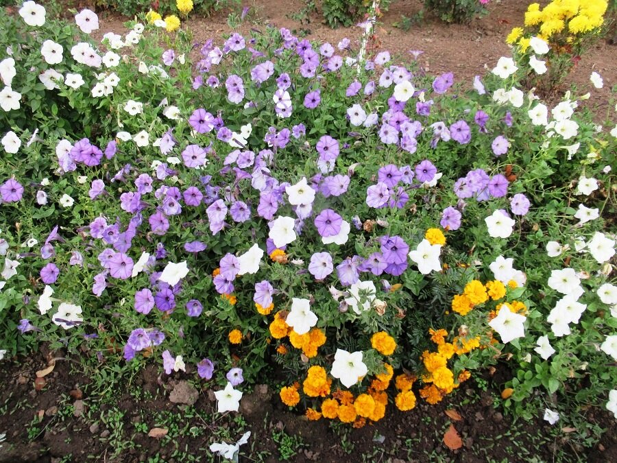 Обильное цветение петуний возможно не только летом, но и глубокой осенью. В середине октября можно наблюдать эти яркие цветы, которые соседствуют с хризантемами и желтой листвой хосты, создавая поистине летнюю атмосферу.