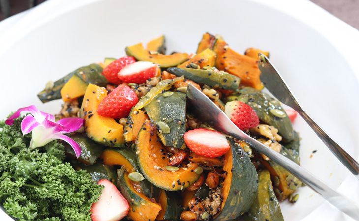 Из тыквы, помидоров и брюссельской капусты можно приготовить вкусный и яркий салат, который отлично подойдет для праздничного стола.