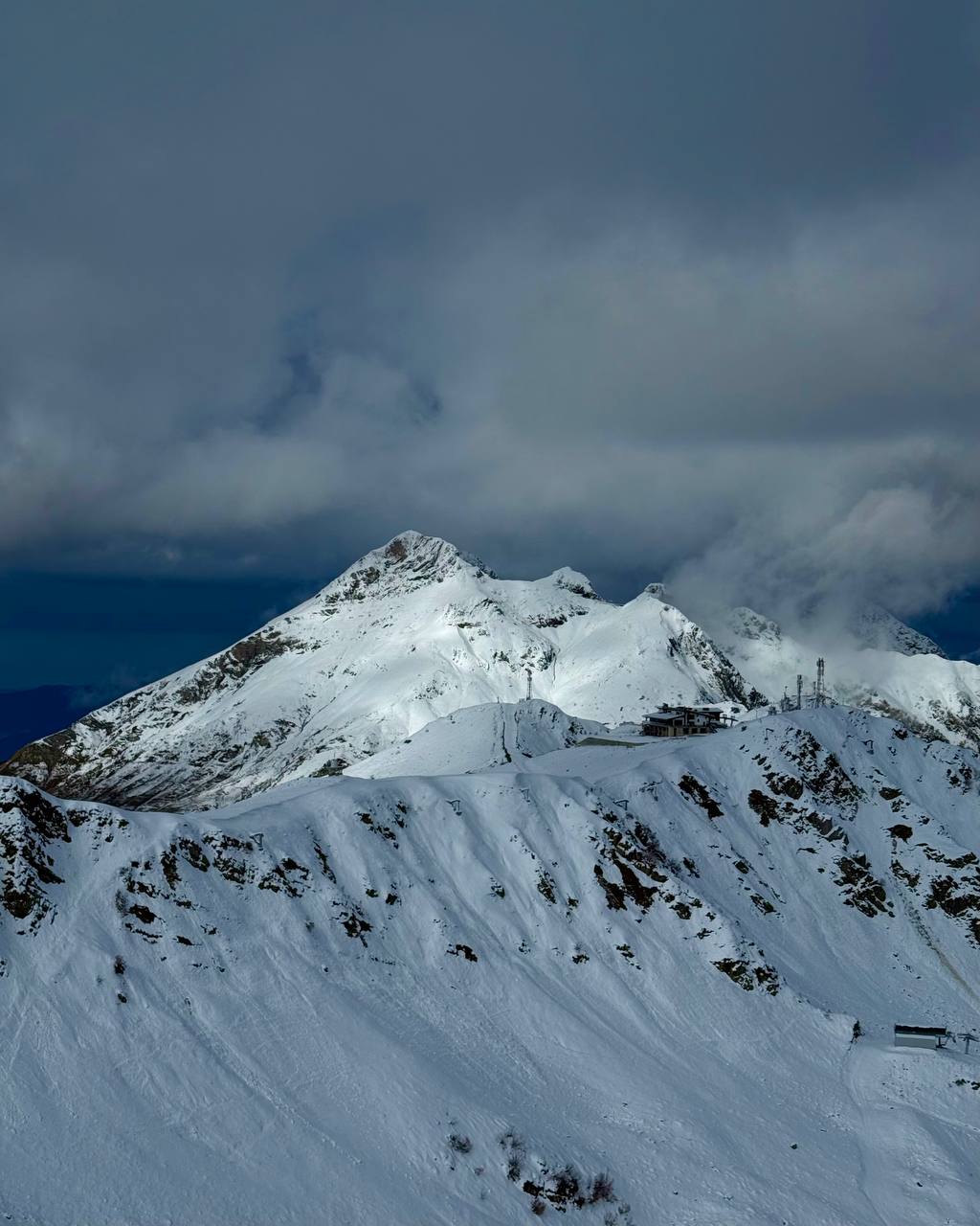 Погода в горах сегодня переменчивая: утром - солнце и просветы в небе, а к обеду всё заволокло тучами, пошёл снег и стало по-настоящему зимне.
