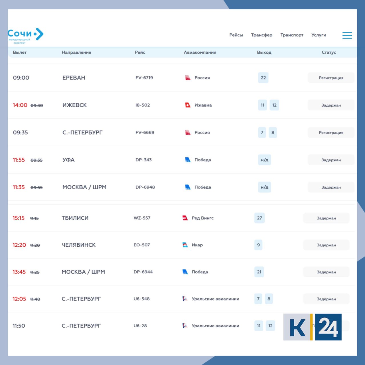 Как минимум семь рейсов задерживаются на прилет в аэропорт Сочи согласно онлайн-табло.