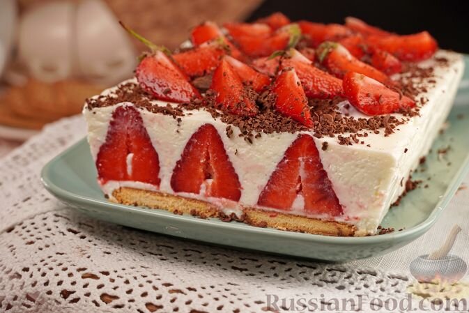 - Творожно-сметанный торт с клубникой и печеньем: Этот торт не требует выпечки и идеально сочетает в себе нежную текстуру творога и свежесть клубники. Легкий и стильный, он станет звездой любого стола.
