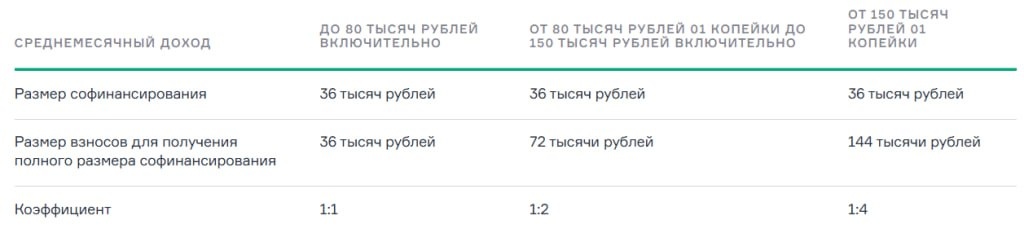 Кроме своих накоплений, вкладчики могут рассчитывать на государственное софинансирование в размере 36 000 рублей в год в течение 10 лет. При этом, если ежегодный доход не превышает 80 000 рублей, соотношение софинансирования составит 1 к 1. Для тех, кто зарабатывает больше, действуют другие правила — соотношение может достигать 1 к 4, что делает этот вариант особенно привлекательным для людей со средними доходами.