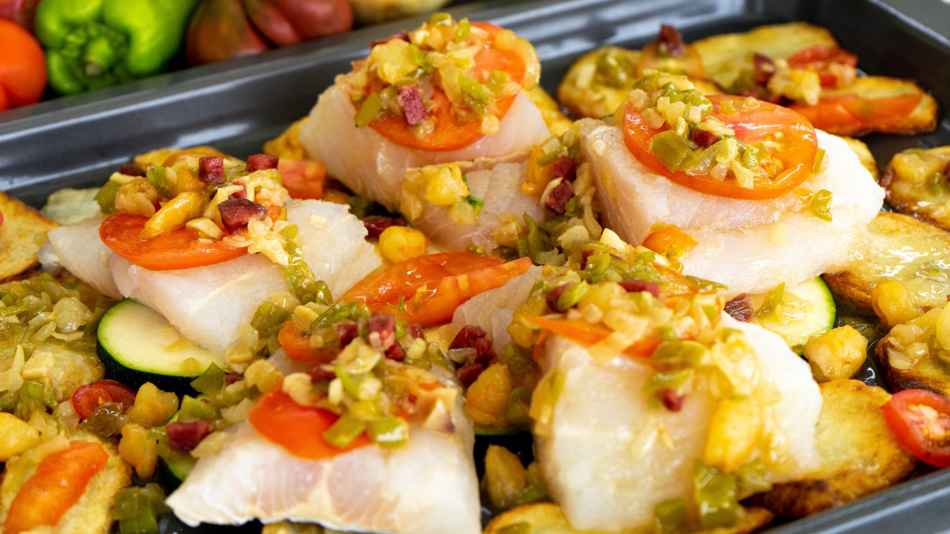 Возьмите форму для запекания и выложите туда слой с луком и морковью, а по кругу украсьте помидорами. В центр пойдет хек: каждое филе надо надрезать и вложить туда ломтик лимона. Сверху посыпьте блюдо тертым сыром и измельченной зеленью. Накройте противень фольгой и отправляйте в разогретую до 180 градусов духовку. Через 45-50 минут рыбу можно подавать к столу, передает портал «1000Menu».