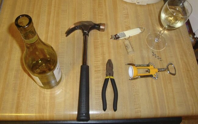 - Длинный винт с отверткой: Завинчивая длинный винт в пробку, оставляя 2,5 см, последующий удар молотком по винту поможет извлечь пробку. Метод достаточно надежный, но требует усилий.