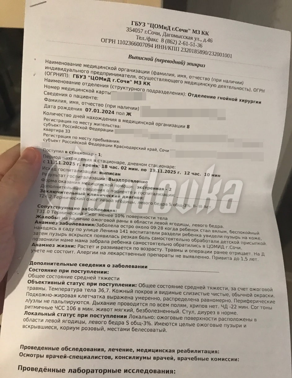 Годовалый ребенок получил химический ожог ягодиц в детском саду Адлера — из учреждения его вынесли на руках