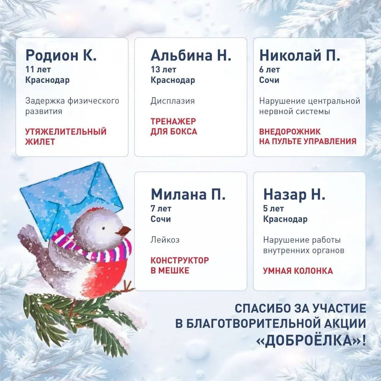 Исполнить желание может каждый: ребята мечтают о простых вещах. Например, Назар из Краснодара хотел умную колонку, Милана — конструктор в мешке, а Николай из Сочи — внедорожник на пульте управления. Сделать все это можно онлайн на официальном сайте акции, что очень удобно, а сам подарок уже доставят добровольцы. Новогодняя пора — одна из самых волшебных и долгожданных для наших детишек, поэтому важно создать для них настоящий праздник.