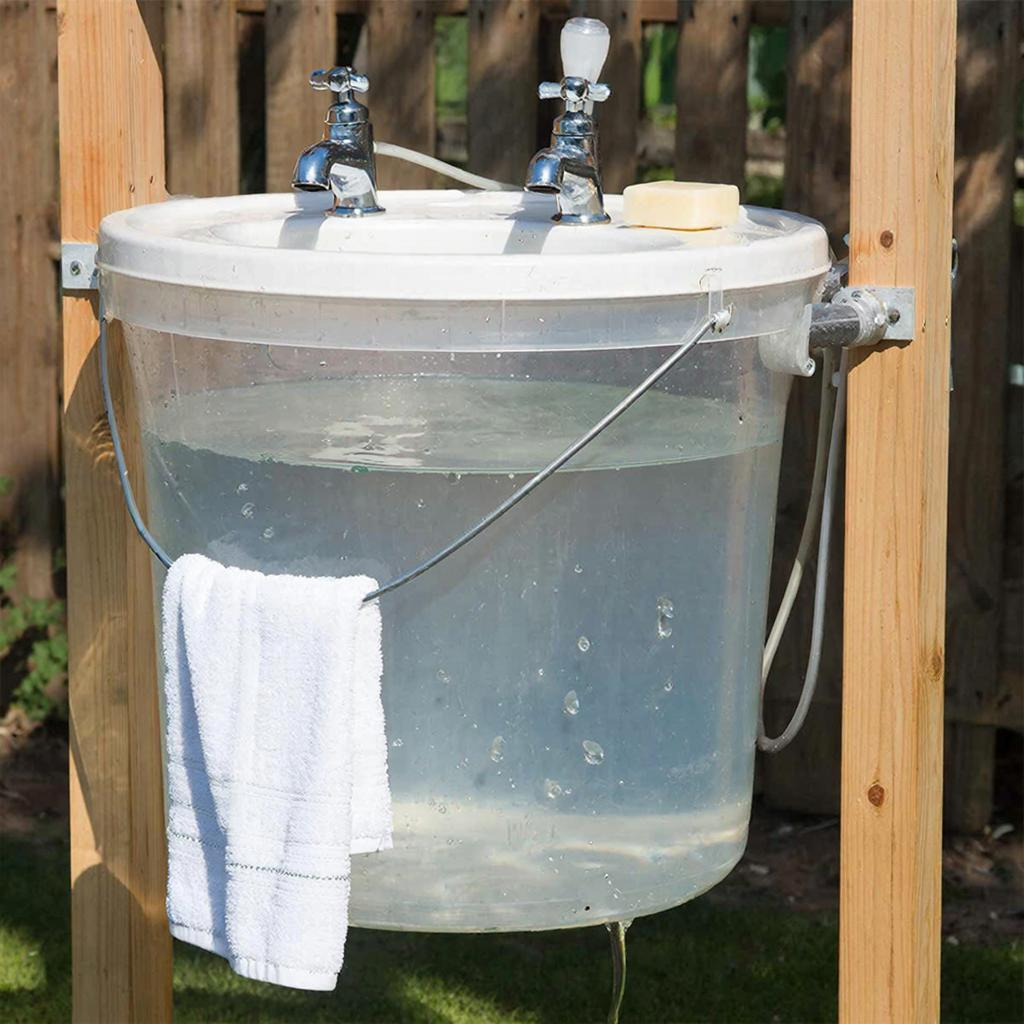 Самый простой способ — установить настоящий кран. Для этого на канистре необходимо создать аккуратное отверстие (диаметром, соответствующим крану) на высоте 5-7 см от дна. Подходящие краны продаются в садоводческих магазинах и обычно пластиковые с ручкой. Герметичность обеспечивают резиновые или силиконовые шайбы, которые устанавливаются с обеих сторон канистры. Наконец, кран затягивается фиксирующей гайкой. Такой умывальник будет крайне удобным: открыл кран — вода потекла, закрыл — она остановилась.