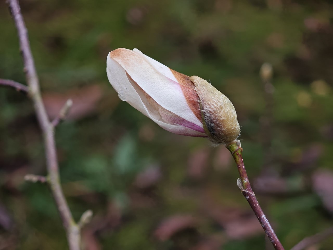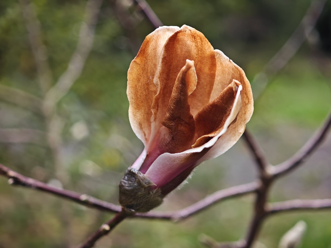 Низкие ночные температуры «обожгли» нежные лепестки магнолии, придав им медный оттенок.