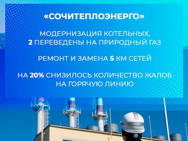 МУП «Сочитеплоэнерго» выполнены работы по модернизации, техническому перевооружению котельных, переводу двух котельных с твердого и жидкого топлива, в том числе с сжиженного на природный газ, выполнен ремонт и замена тепловых сетей общей протяжённостью 5 километров.