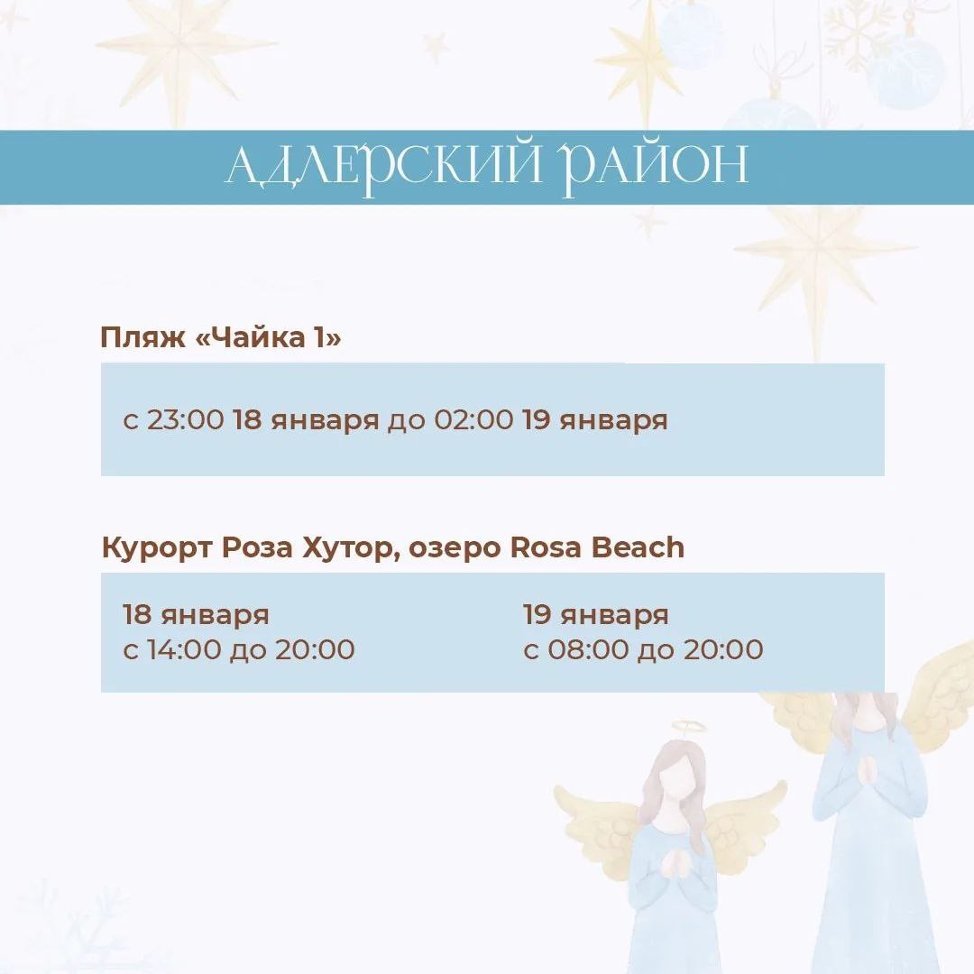 Пройти обряд омовения жители и гости Сочи смогут во всех четырех районах курорта. Для Крещенских купаний определены 10 официальных мест для дневных и ночных купаний. Они состоятся при благоприятных погодных условиях 18 и 19 января.
