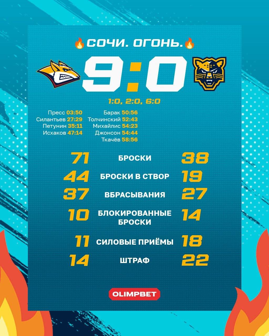 Магнитогорский «Металлург» обыграл «Сочи» со счетом 9:0 в домашнем матче регулярного чемпионата «Фонбет» — КХЛ.Шайбы забросили Робин Пресс (4-я минута), Дмитрий Силантьев (28), Александр Петунин (36), Руслан Исхаков (48), Дерек Барак (51)...