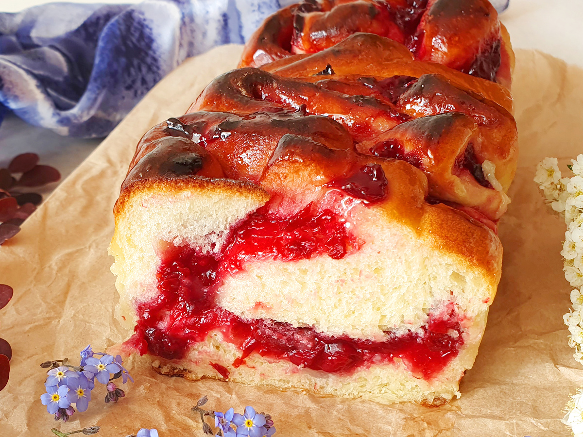 Когда тесто поднялось, его делят пополам и раскатывают каждую часть в прямоугольник толщиной 4-5 мм, смазывая вишневой начинкой. После разрезания теста вдоль, края загибают к центру, формируя своеобразные «рюши». Пироги укладывают в одноразовые формы и оставляют еще раз подходить.