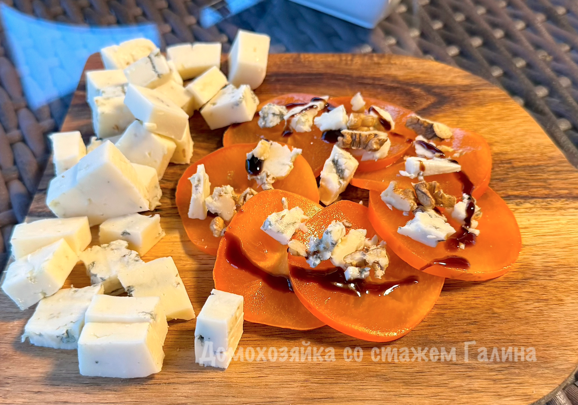 При подготовке закуски следует помнить о деталях. Хурму стоит нарезать на тонкие кружочки и красиво выложить на сервировочное блюдо. Сыр можно поломать на маленькие кусочки и аккуратно разложить по фруктам. Завершите композицию, добавив обжаренные на сухой сковороде грецкие орехи, которые придадут блюду текстурную контрастность и дополнительные нотки вкуса. Для финального штриха можно полить все бальзамическим соусом с инжиром — он добавит кисло-сладкую изюминку и завершит необычное сочетание на высок note.