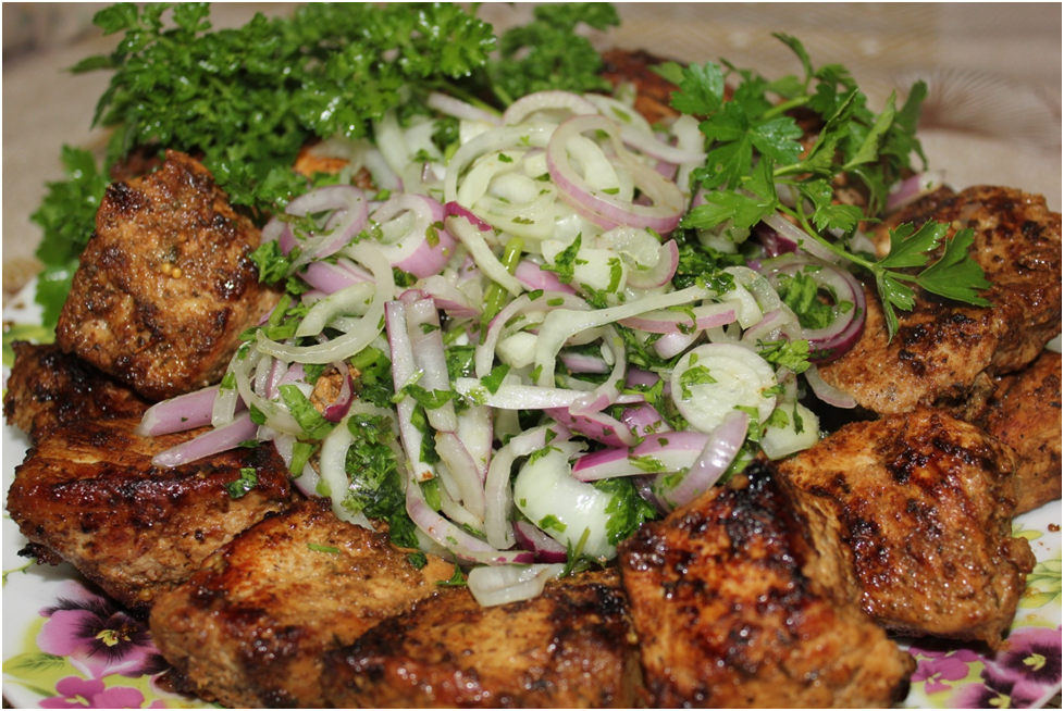 - Приготовление: Мясо нарезать крупными кусками, лук натереть и отжать сок, затем смешать с мясом, добавив остальные ингредиенты и оставить в холодильнике.