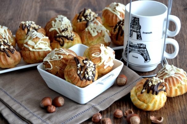 Остывшие профитроли можно начинить кремом, используя любой из удобных способов: через прокол или надрез. Затем каждую порцию можно украсить топленым шоколадом и посыпать орехами или миндальными лепестками. В результате получится множество замечательных десертов, которые точно не оставят равнодушными ваших гостей!