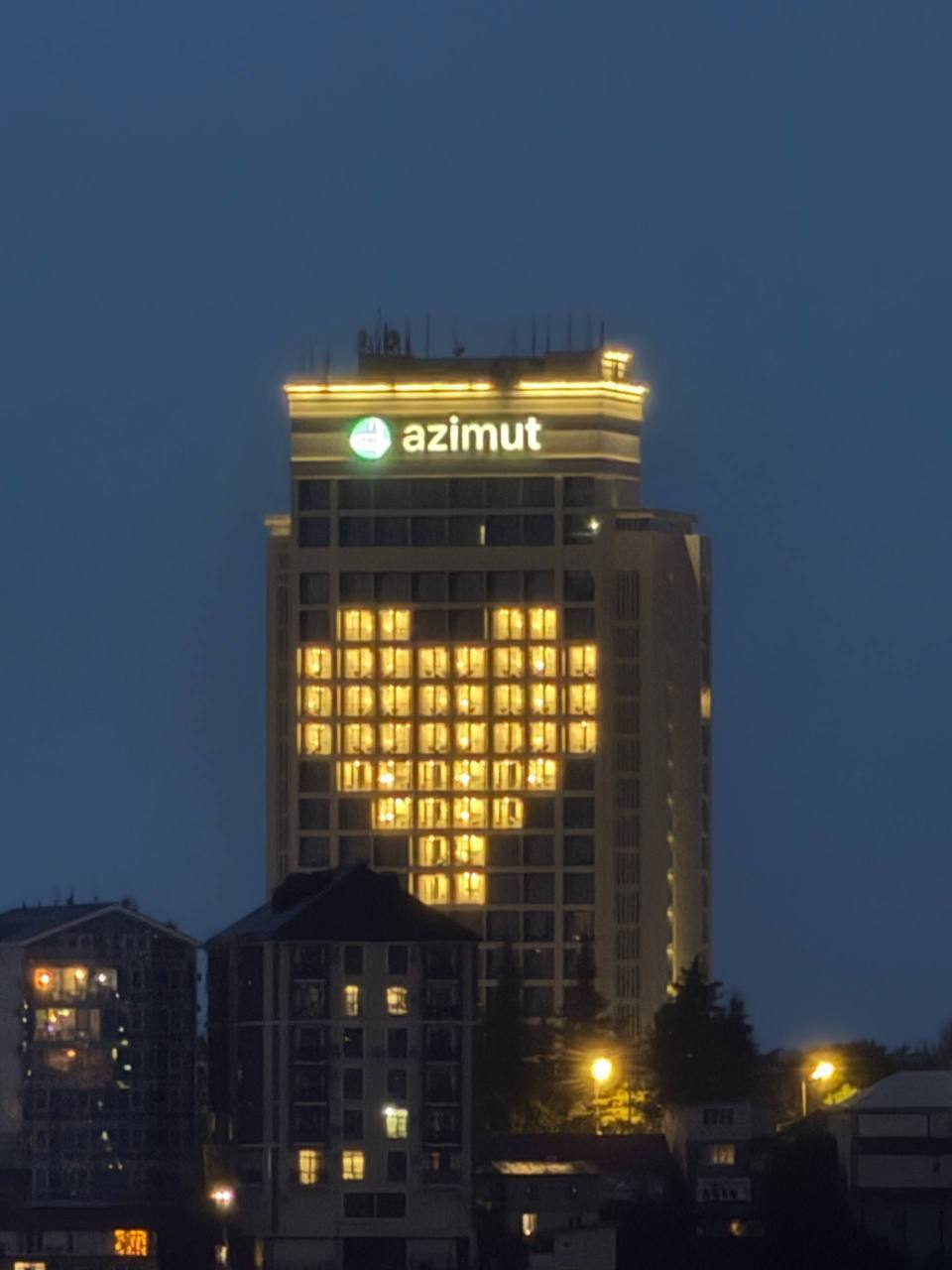 Вчера поздно вечером жители и гости города могли наблюдать очень романтичную картину. На фасаде 24-этажного отеля Azimut (Виноградная, 101) вспыхнуло гигантское сердце.