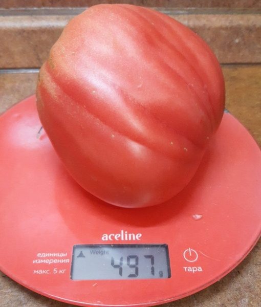 Плоды массой 400–1000 граммов образуют крупную гроздь на мощном стебле. Чтобы добиться рекордных экземпляров, применяют нормирование кистей: на первых кистях оставляют 2–3 завязи, выше по стеблю — 4–5 плодов. Ягоды плотные, мясистые, с насыщенным вкусом и характерной сладостью.