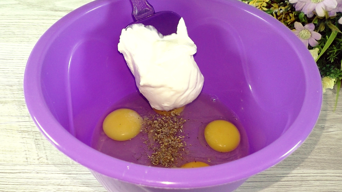 Добавьте в ячную смесь сметану, а затем растительное масло. Перемешайте все ингредиенты до однородности.
