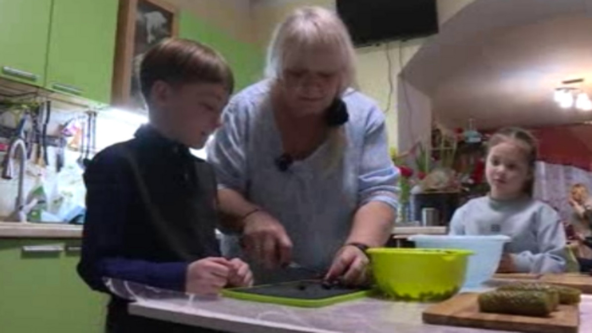 На кухне Бурханских готовят вместе с детьми постный салат Багет, в состав которого входят виноград, сухарики, фасоль и соленые огурцы. Ребята старательно помогают нарезать овощи для основного блюда запеченной картошки с грибами.