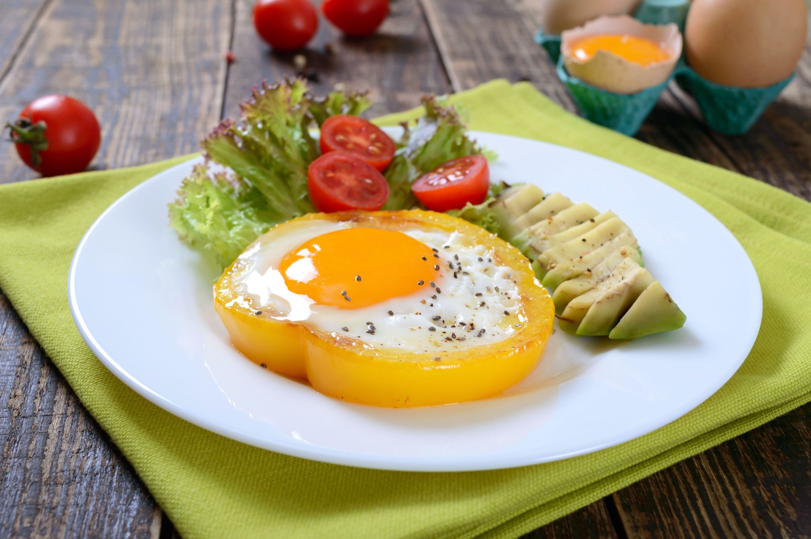 Переворачиваем перец и в каждый разбиваем по яйцу. Доводим до готовности. Перед подачей на стол можно посыпать свежей зеленью или тертым сыром, пишет портал Iamcook.