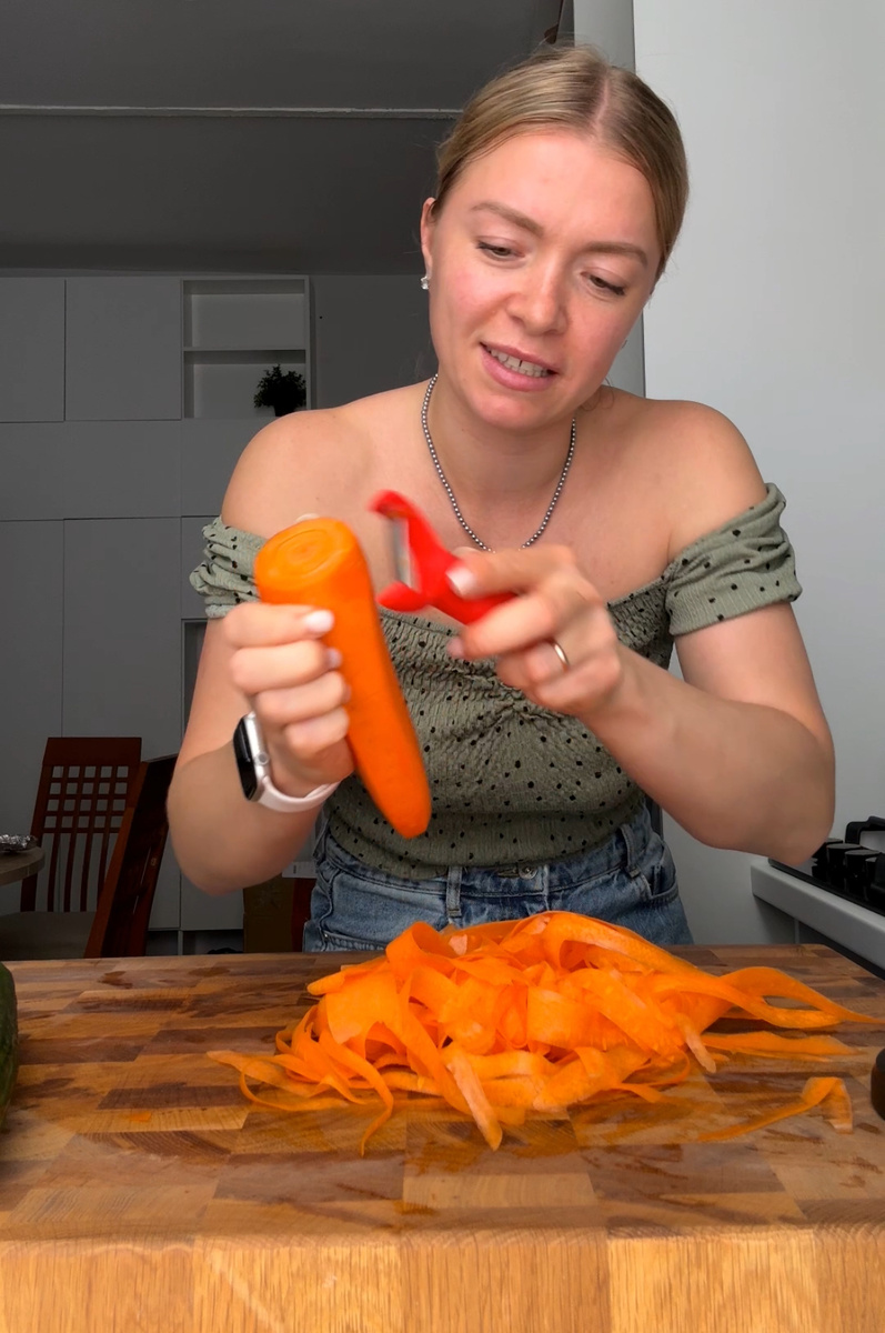 Для начала необходимо нарезать огурцы и морковь. Использование овощечистки поможет создать тонкие ленты, которые идеально подойдут для салата. Затем приготовления заправки: все ингредиенты (кешью, авокадо, лимонный сок, чеснок, укроп, горчицу и оливковое масло) аккуратно смешиваются в блендере. После этого добавляется вода до достижения желаемой консистенции.