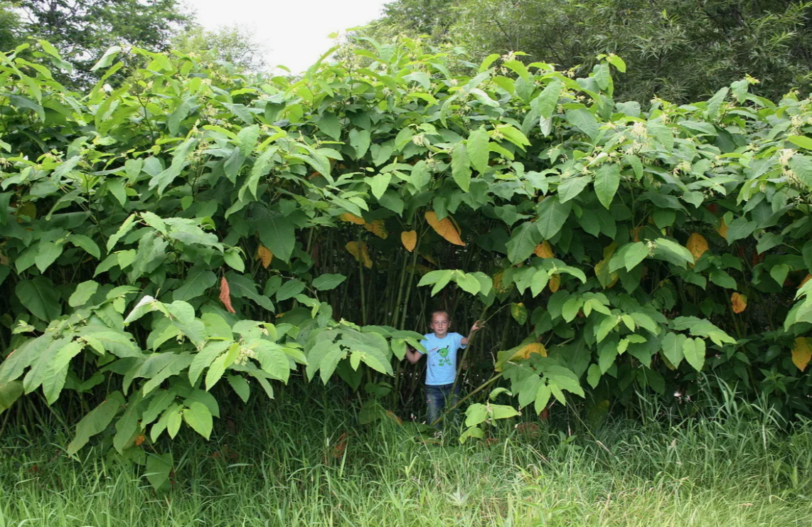 - Горец сахалинский. Этот зеленый гигант способен создать непроходимую стену всего за один сезон. Однако его корни разрастаются с такой интенсивностью, что удалить его задача не из легких. Корчевка может занять целые годы.