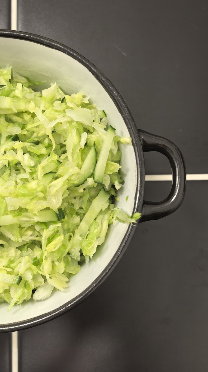 Порезать капусту — это не просто действие. Здесь важен каждый шаг: капусту нужно тщательно помять, чтобы она выделила сок, который сделает салат нежным и сочным. Прибавив щепотку соли, ее необходимо «потрясти» руками, сжимая и перетирая. Это поможет капусте стать мягче и более влажной.