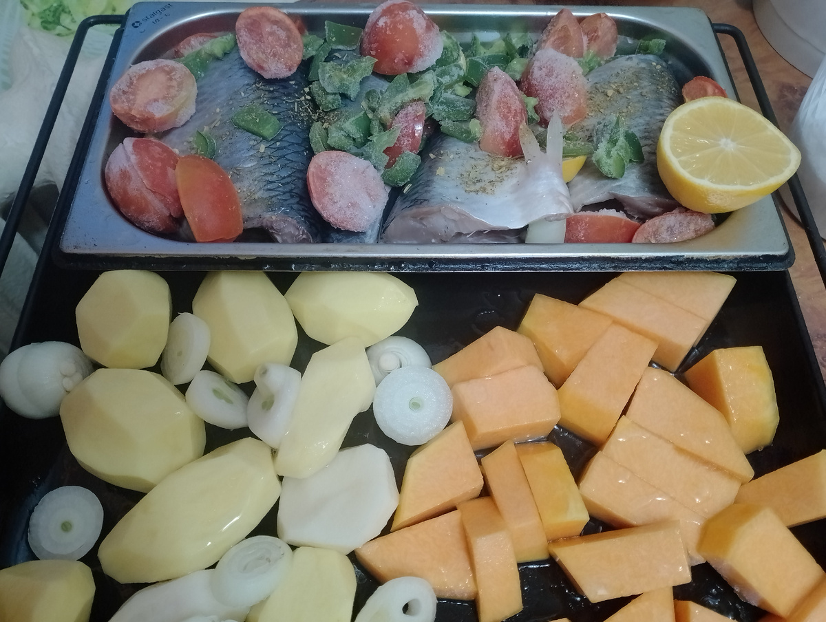 Что касается овощей, здесь можно проявить фантазию. Прекрасно подойдут картофель, тыква, лук, сладкий перец и помидоры. Замороженные овощи, такие как помидоры и перец, отлично сохранят свои вкусовые качества и только добавят текстуры блюду. Все ингредиенты нужно посолить и аккуратно перемешать.