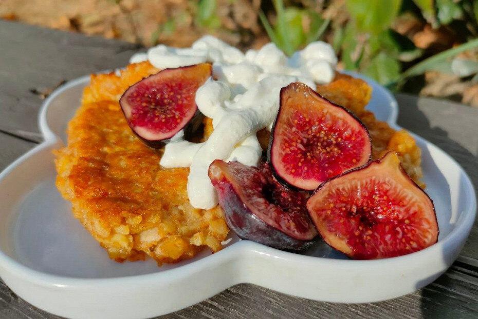 В этом простом, но восхитительном рецепте основным ингредиентом выступают яблоки, а используемая цельнозерновая мука делает его более полезным. Можно менять сорт яблок на свой вкус, однако сладкие фрукты позволят значительно снизить количество добавляемого сахара, который также можно заменить на любой подсластитель. Для жарки оладий подходит как сливочное масло, так и гхи (топленое масло), в результате чего угощение превосходно на любой стадии — горячем или холодном.