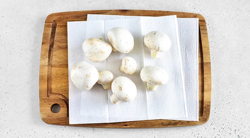 Если шампиньоны свежие, их вполне можно не чистить. Однако если они уже подержались, стоит удалить пленку от мякоти. Разделите грибы: ножки нарежьте тонкими кружочками, а шляпки – пластинками.