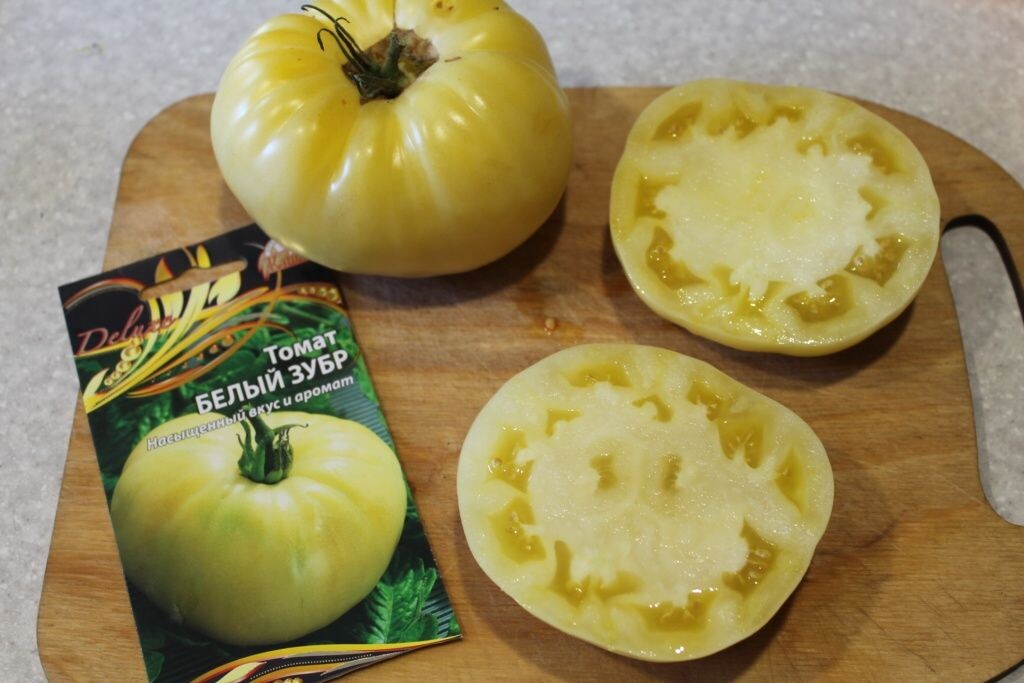 Плоды томата «Белый зубр» отличаются плоско-округлой формой и нежной, мясистой мякотью, что делает их прекрасным выбором как для употребления в свежем виде, так и для переработки. Хотя сорт не подлежит длительному хранению, именно это качество делает его настоящим деликатесом для настоящих гурманов.