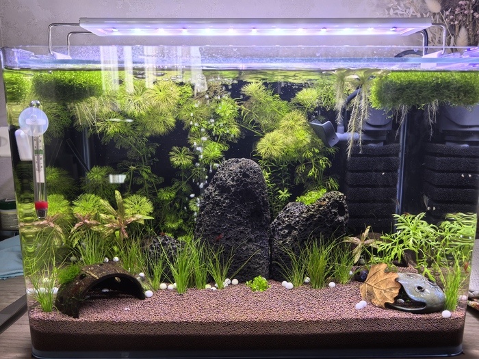 С момента начала работы над первым аквариумом прошло шесть недель, и в этом время произошло немало изменений. Во время очередной чистки было замечено, что мхи, которые так понравились, разрослись до неподъемных размеров и стали источником грязи, поднимая облака мути при каждом шевелении. В результате решено заменить их на более практичные элеохарисы мини. На правом камне мох также убрали, установив вместо него Микрантенум Монте-Карло, который достался в подарок. Ожидаем, как будет выглядеть результат.