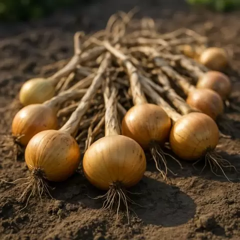Оптимальный момент для сбора лука — это время, когда ботва пожелтела и легла на землю. Признаки зрелости включают: