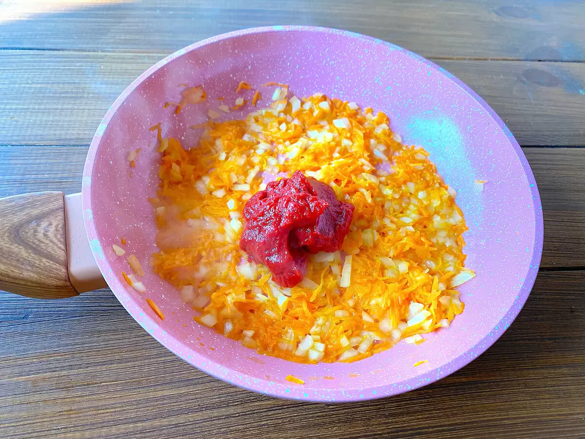 - Обжарить нарезанный лук и натертую морковь на растительном масле до мягкости, добавить томатную пасту и обжарить еще немного.