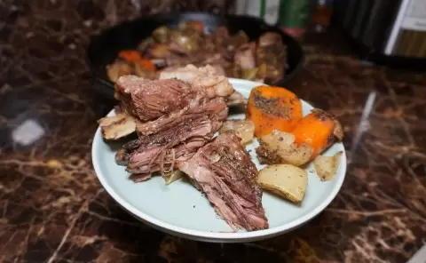 Приправить смесь солью, черным перцем и прованскими травами. Затем накрыть казан крышкой и поставить его в предварительно разогретую до 150°C духовку. Оставить на 5 часов — именно столько времени требуется для того, чтобы мясо стало мягким и нежным.