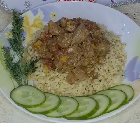 Спустя час, необходимо открыть крышку и добавить соль, сахар, уксус и специи: молотый кориандр и черный перец. Все тщательно перемешивается, накрывается крышкой и тушится еще 60 минут.