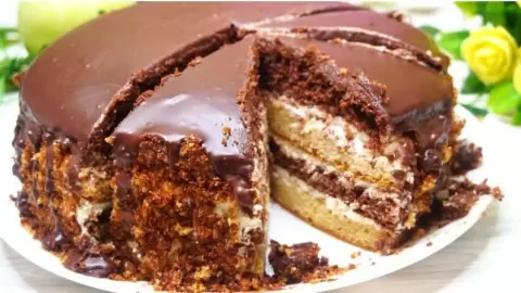 Собрать торт, пропитывая коржи и смазывая каждый из них кремом. Верх торта украсить шоколадной глазурью и оставить на некоторое время для пропитки. Через пару часов торт станет поистине нежным и невероятно вкусным.
