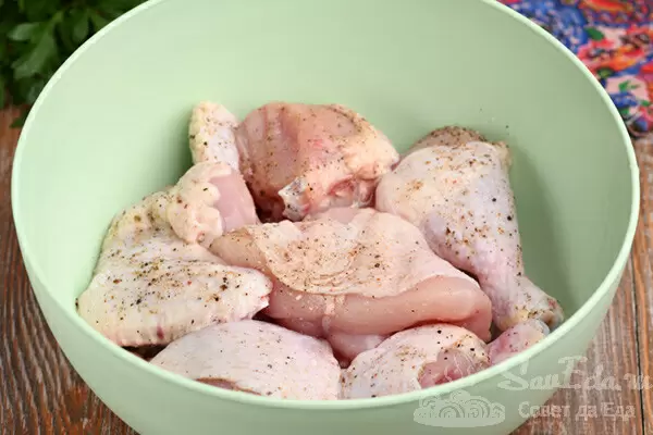 Для этого рецепта потребуется курица весом 1.5 кг, которую следует нарезать на 12 кусочков (без хребта). Кусочки натирают солью, молотым перцем и помещают в глубокую миску. Если хотите, используйте только ножки, бедра или филе.