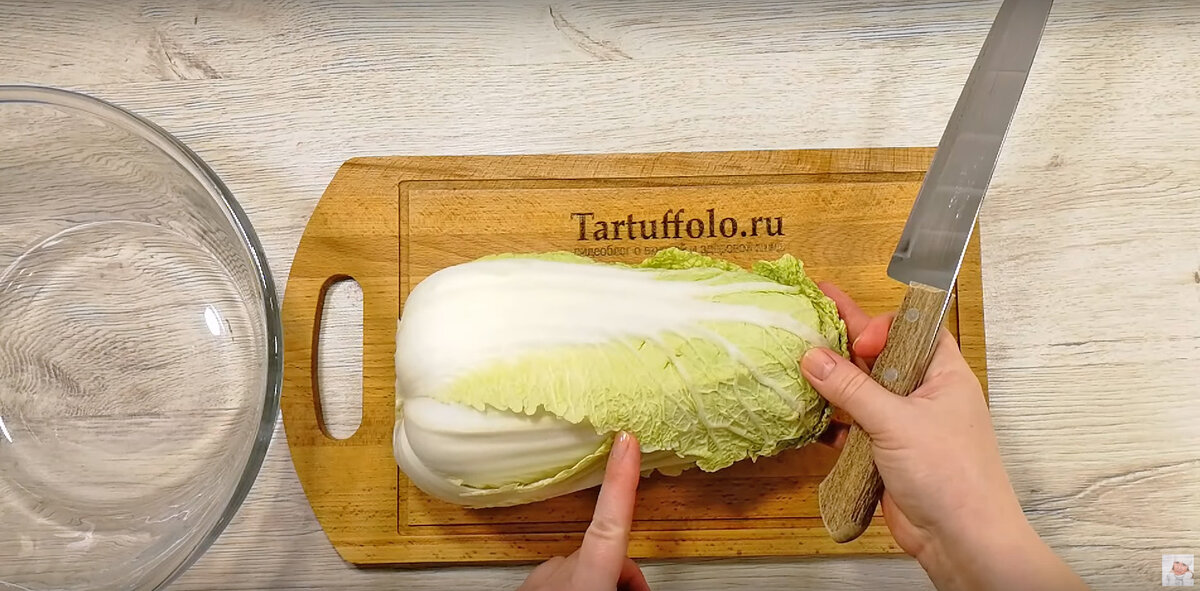 Для начала капусту нужно нарезать. Кочан удобнее всего разрезать вдоль на несколько частей, а затем нарезать поперек, чтобы получить мелкие кусочки. После этого капустные ломтики отправляются в большую миску.