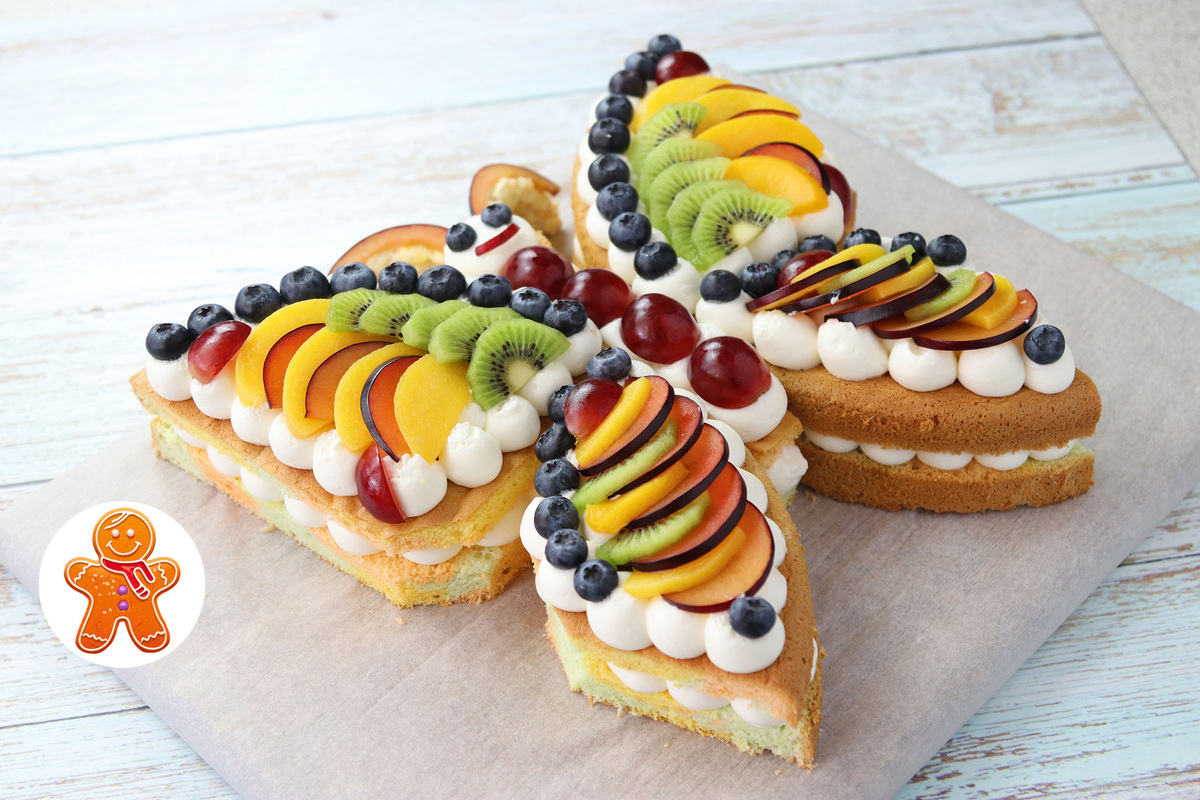 Для завершения, пропитайте один из коржей сиропом и аккуратно нанесите на него половину крема. Уложите второй корж, добавив оставшуюся часть крема. Украсьте торт свежими фруктами и ягодами на ваш вкус. Для создания интересных деталей можно использовать обрезки коржа, сформированные в виде усиков бабочки, зафиксировав их кусочками фруктов. Затем поместите торт в холодильник для полного застывания крема.