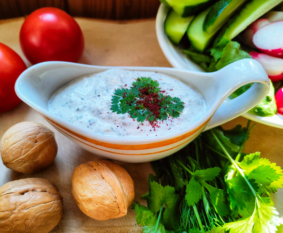 Приготовление этого соблазнительного соуса не займет много времени. Если выбран свежий перец, его лучше предварительно проварить, чтобы уменьшить остроту. Затем необходимо мелко нарезать перец, орехи, чеснок и зелень. Затем все ингредиенты объединить с мацони или другим кисломолочным продуктом.